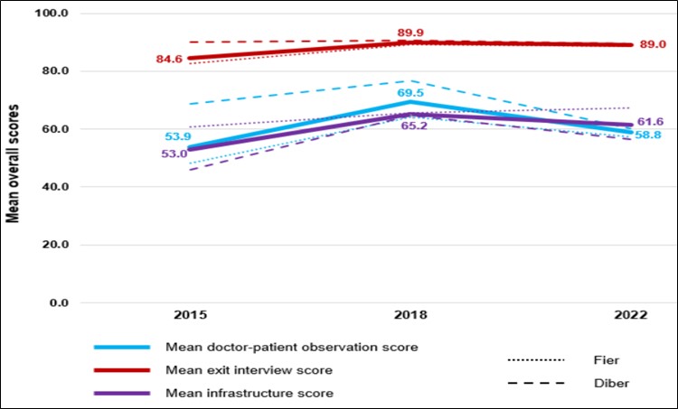 The assessment of healthcare infrastructure reveals a marked improvement between 2015 and 2018, attributed in part to the strategic investments of the Health for All Project (HAP), including the rehabilitation of the 12 healthcare centers in the sample. While the infrastructure score remained relatively stable in 2022 at a mean score of 61.6 points, indicating only a slight decrease since 2018, it shows the importance of continued investments to sustain and enhance the quality of care.